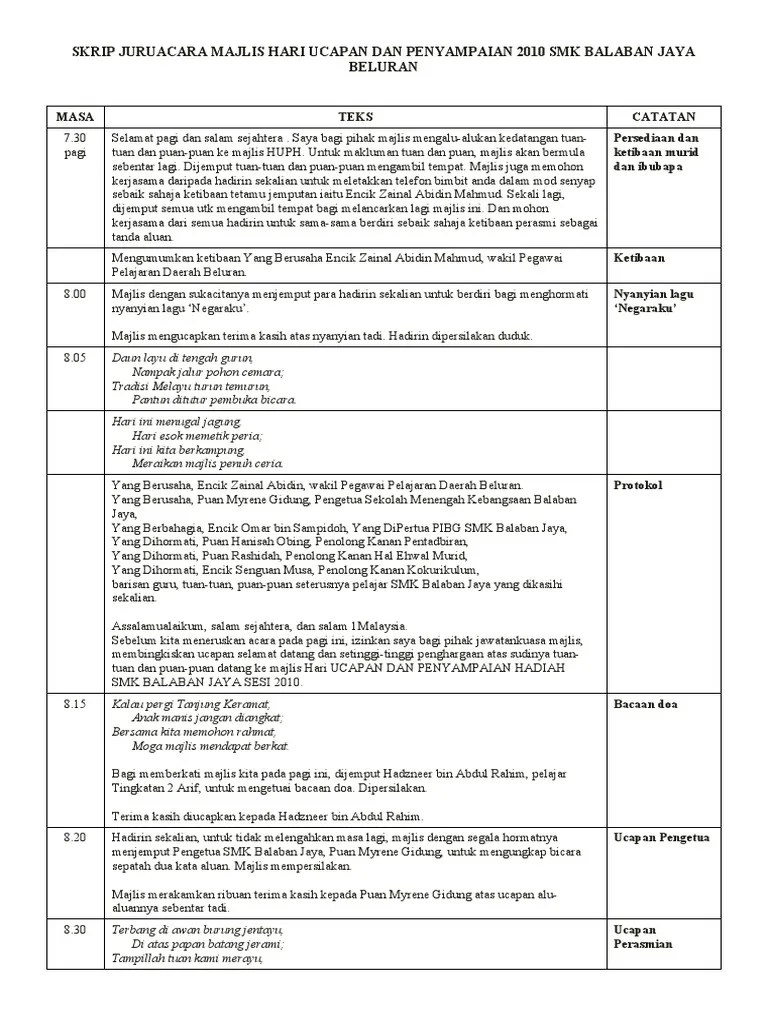 Mengumumkan ketibaan tuan pengetua smvbl tn hj. Skrip pengacaraan majlis makan malam. Jutaan terima kasih saya ucapkan kepada tetamu . Contoh teks ucapan majlis makan malam dan format ringkas teks ucapan pengacara majlis makan malam mpv 2004.